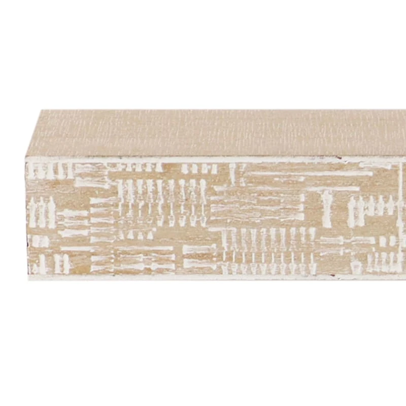 Round out your decor’s visual appeal with this charming 24in. wooden ledge wall shelf. This wall decor’s architectural details add a pop of pattern to your look, while the light scratch edge wood blends effortlessly into any color palette. Hang this modern chic shelving and it’ll finish out your space with wonderful coordinating decor.